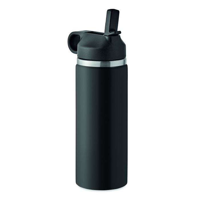 Sticlă termoizolantă, cu perete dublu din oțel inoxidabil reciclat (90% inox reciclat și 10% oțel inoxidabil), capac cu mâner de prindere în PP și capac cu pai integrat. Fără scurgeri. Capacitate: 500 ml.