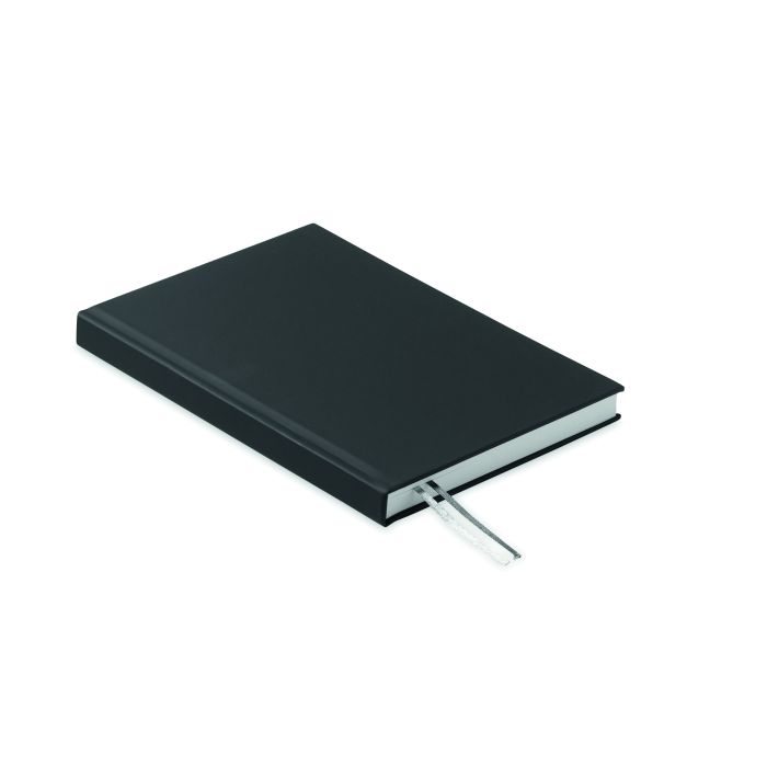 Caiet jurnal A5 cu copertă din poliester post consum reciclat 60% și PU 40%. Bloc lipit. 256 de pagini liniate din hârtie reciclată de 70 gsm (128 foi). Cu 2 marcaje de pagină din panglică de poliester.