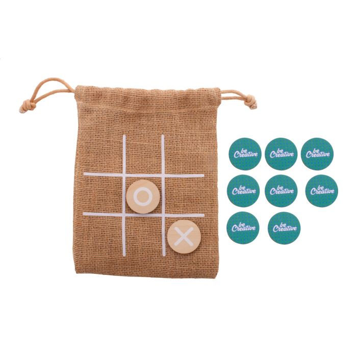 Joc X și 0 realizat la comandă din placaj de mesteacăn, cu 10 jetoane și husă de transport de iută. Prețul include imprimare color identică pe spatele tuturor jetoanelor. MOQ: 100 buc.
