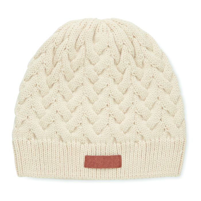 Căciulă tricotată cu model răsucit din material RPET cu etichetă pentru zona de imprimare.