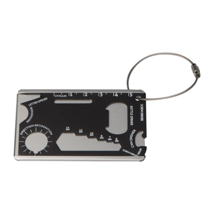Etichetă de bagaj şi kit supravieţuire din aluminiu cu deschizător de plicuri, riglă, deschizător de sticle, desfăcător de conserve, şurubelniţă, busolă, cheie și peeler. Setul perfect de unelte de supravieţuire.