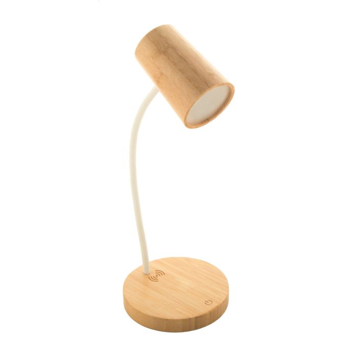 Lampă de birou multifuncțională, din bambus și plastic PP reciclat, cu încărcător rapid fără fir încorporat (15W). Cu moduri de lumină caldă, naturală și rece. Inclusiv cablu de încărcare USB.