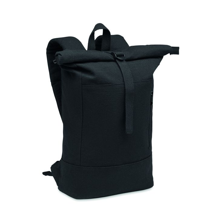Rucsac cu fermoar pentru laptop 15 inch, cu fermoar, din bumbac reciclat și poliester reciclat (70%/30%). Buzunar frontal cu fermoar. Spate și curele de umăr căptușite. 340gr/m².