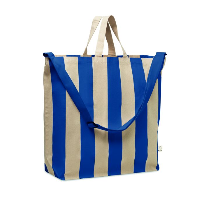Geantă de plajă foarte mare cu dungi din bumbac reciclat (80%) și poliester reciclat (20%) de 280 gr/m², cu buzunar interior. Mânere scurte și o curea de umăr mare reglabilă.