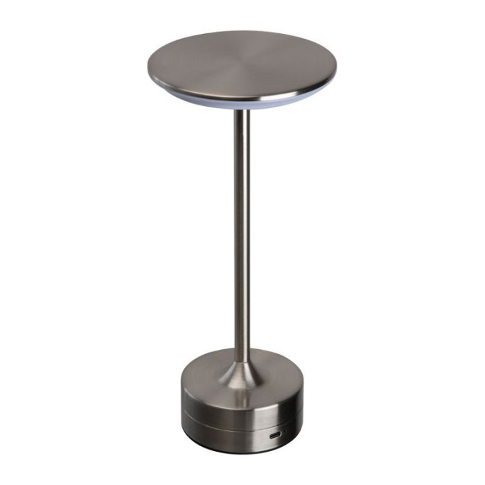 Lampă de birou din oţel inoxidabil cu acumulator (800 mAh). Intensitatea luminii poate fi ajustată și culoarea luminii poate fi schimbată între lumină caldă și rece. Include cablu de încărcare de tip C.