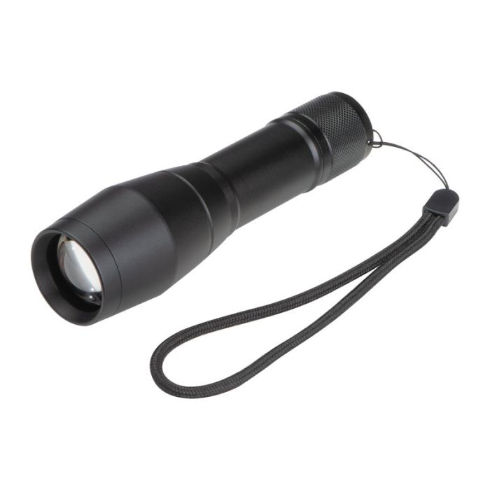 Lanternă LED, din aluminiu cu 3 funcţii diferite de iluminare: continuu, SOS și intermitent. Putere de 10W, are și curea de mână.