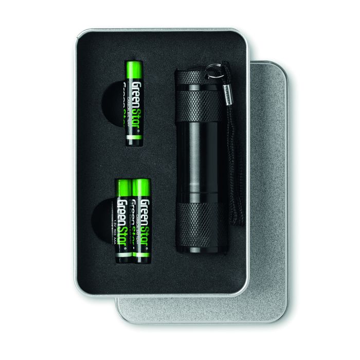 Lanternă din aluminiu, cu 9 leduri. Include 3 baterii AAA. Include curea detașabilă. Ambalată în cutie metalică.