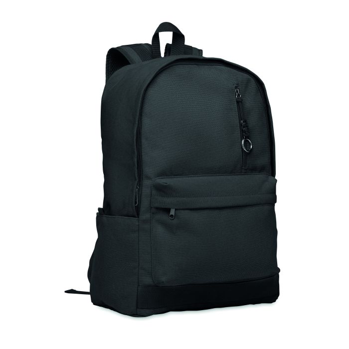 Rucsac laptop 15 inch din reciclat pânză spălată. Buzunar frontal mare cu fermoar și compartiment interior pentru laptop. Buzunar frontal mic cu fermoar. Două buzunare laterale glisante. Curele pentru spate și umăr, panoul din spate și partea inferioară căptușite. 450 gr/m².