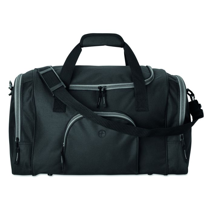 Geantă sport din poliester 600D cu 2 compartimente laterale cu fermoar şi 1 buzunar frontal cu fermoar cu orificiu pentru căşti. Prevazută cu baretă de umar detaşabilă şi reglabilă.