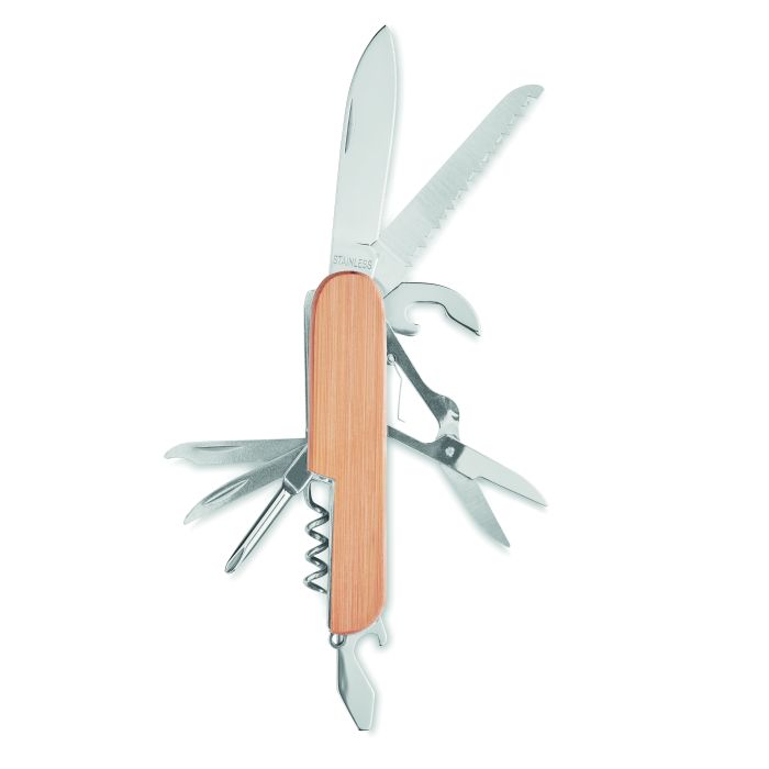 Briceag multifuncțional din inox cu mâner de bambus. 9 funcții. Bambusul este un produs natural, astfel pot apărea diferențe la personalizare.
