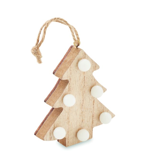 Decorațiune brad din lemn (80% lemn de plop și 20% lemn de buruieni), cu 6 lumini LED și șnur. Include 1 baterie CR2032. Lemnul este un produs natural, în consecință pot apărea diferențe de culoare, dimensiune sau la personalizare.