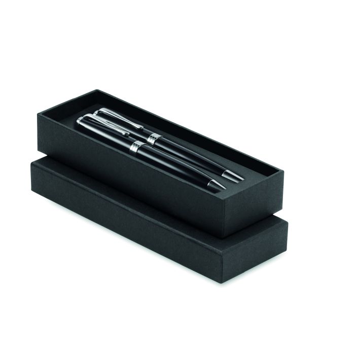 Set instrumente de scris: stilou cu bilă twist și roller din oțel inoxidabil reciclat. Mină albastră și, respectiv, neagră. Prezentat în cutie neagră.
