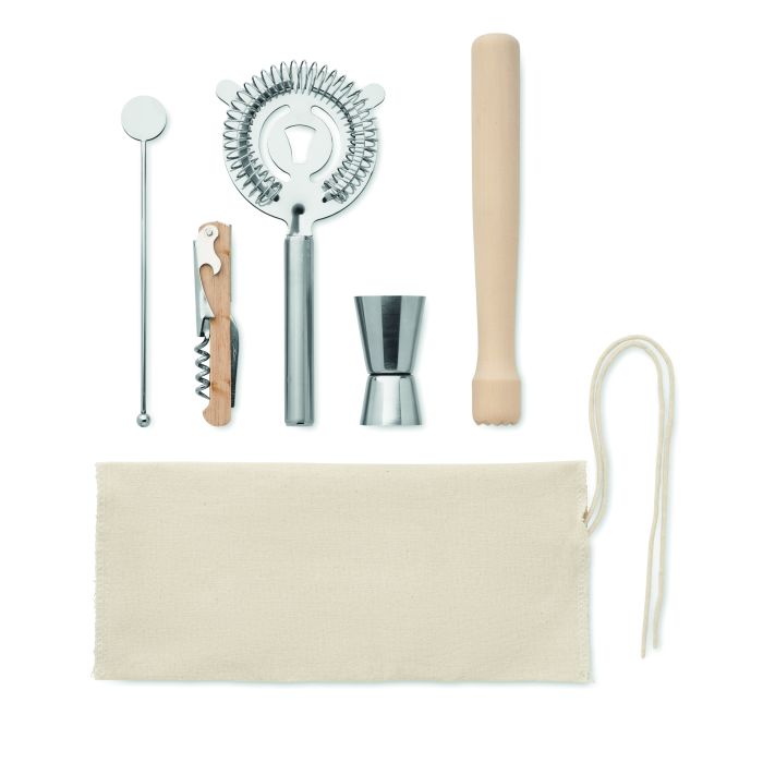 Trusă de cocktail în pouch de bumbac cu șnur. Include 5 piese: un jigger de măsurare cu două fețe (15 și 30 ml), un tulburel din lemn, o strecurătoare de cocktail, un agitator de băuturi și un cuțit tirbușon pentru chelner.