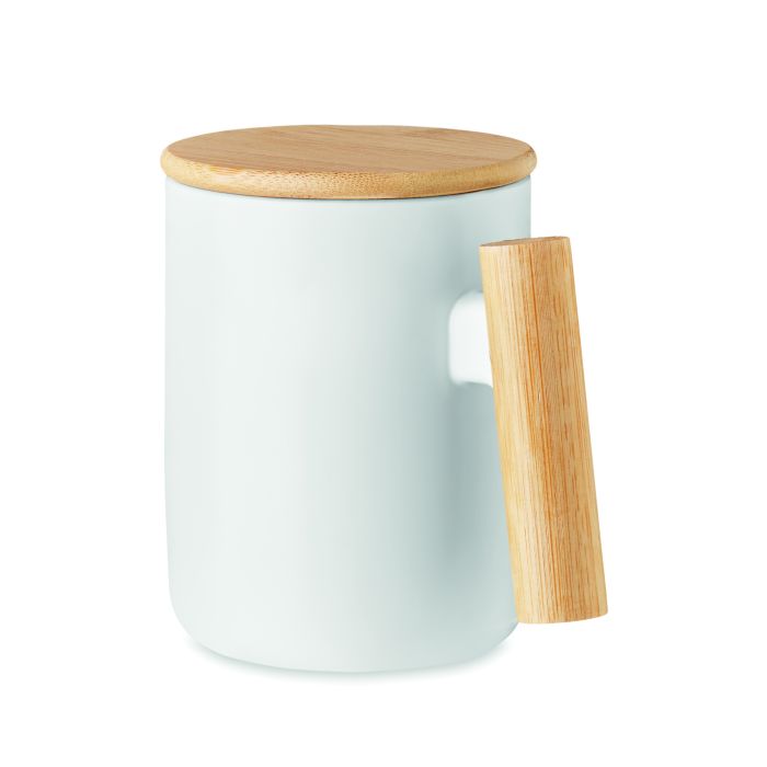 Cană din porțelan cu capac din bambus și mâner. Capacitate: 380 ml. Bambusul este un produs natural, în consecință pot apărea diferențe de culoare, dimensiune sau desen.