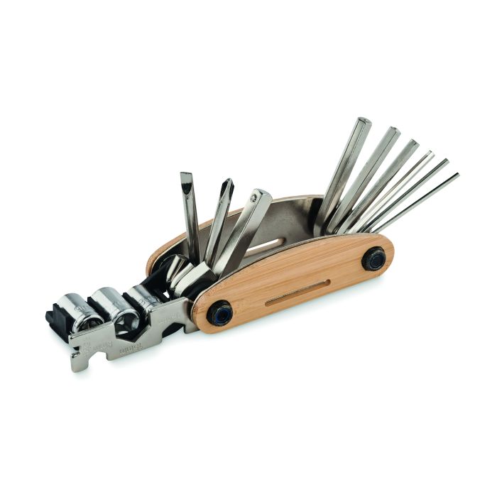 Unealtă de buzunar multifuncțională din oțel inoxidabil cu capac din bambus. 11 funcții. Include: chei hexagonale, cheie plată , prelungitor de manșon, șurubelniță Phillips și cheie de soclu.