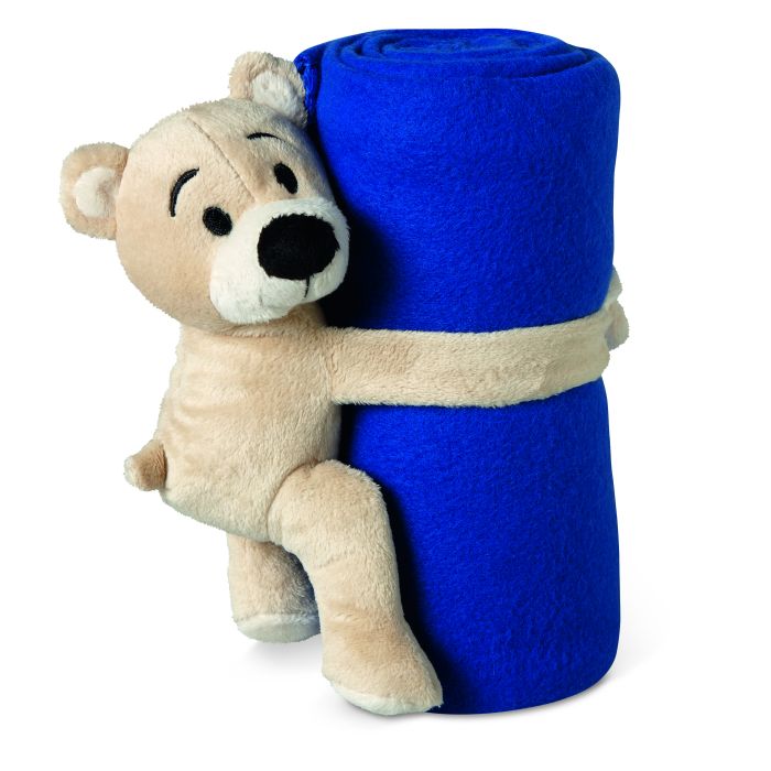 Pătură polar pentru copii cu o jucărie în formă de ursuleț care ține pătura cu lăbuțe închise cu arici.