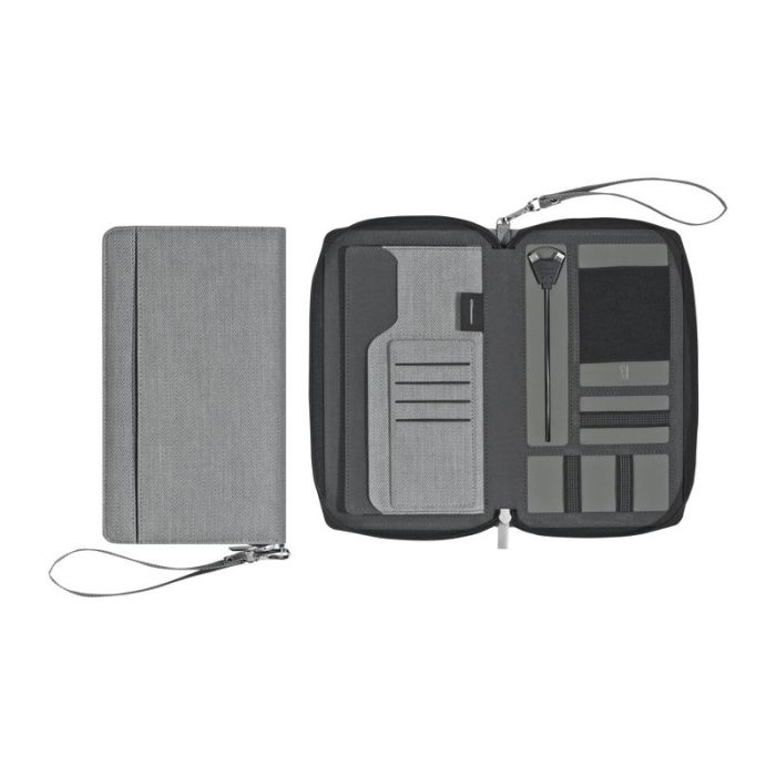 Mapă pentru documente, cu power bank integrat (capacitate 4.000 mAh), cablu de încărcare USB, 8 buzunare, compartiment pentru telefonul mobil, buclă pentru borsetă și curea pentru încheietura mâinii.