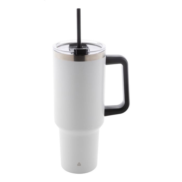Cană termoizolată, din oțel inoxidabil reciclat, cu perete dublu, cu capac de băut PS și pai din PP. 1200 ml.