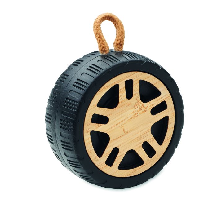 Boxă wireless 5.3 în formă de anvelopă, din ABS reciclat, cu detalii din bambus și mâner din frânghie de bumbac. Baterie reîncărcabilă de 400 mAh.