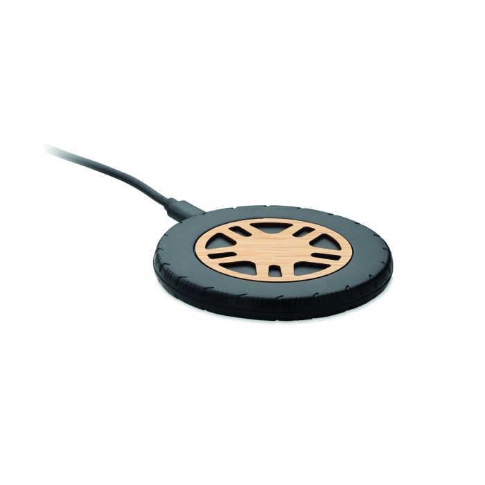 Încărcător wireless de 15 W din ABS reciclat și capac din bambus. Design în formă de anvelopă. Conectați dispozitivul la computer, așezați smartphone-ul pe el și lăsați-l să se încarce. Ieșire: DC 9V/1,10A (15W) pentru încărcare rapidă. Compatibil cu cele mai recente androide, iPhone® 8, X și mai noi.
