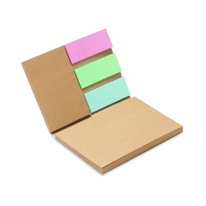 Bloc de notițe autocolante din 2 piese cu copertă din hârtie reciclată (25 de foi) . Blocuri de notițe lipicioase (50 de foi) și 3 semne de pagină în culori asortate. Fabricat în UE.