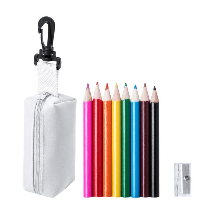 Set de 8 buc creioane colorate(ascuțite) din lemn și ascuțitoare. În suport din poliester 420D.