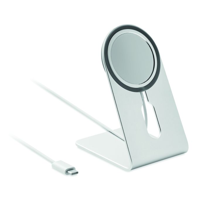 Încărcător magnetic wireless portabil din aluminiu, 15W cu suport pentru telefon. Include un inel metalic magnetic suplimentar pentru a susține încărcarea altor telefoane cu încărcare wireless nemagnetică. Ieșire: 9V/1,67A (15W) pentru încărcar