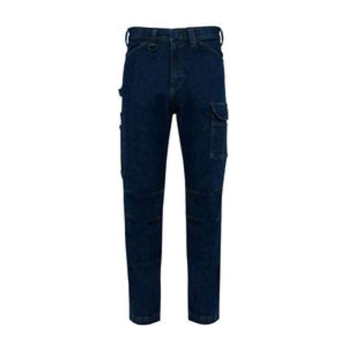 99% cotton/1% elastane. Washable at 60°C, slim fit, denim canvas. Tear-away brand label, reinforced pockets on front and back- left and right sides. 370 g/m². Denim canvas. Washable at 60°C. Slim fit. Button fastening with button cover and metal zip. Front: 2 slanted opening pockets. Left: reinforced seam pocket with flap and tear release fastening + 3-compartment over-pocket, 1 of which has pen compartment. Right: hammer pocket, tape pocket and over-pocket with tear release fastening. Back: 2 patch pockets with reinforced seams, 1 with a tear release fastening flap. Rounded belt at back with wide inner non-slip elasticated band for optimal support. Orange inner buckle at middle of back. Loops with reinforced seams including one large one in the middle of the back and 1 plastic ring at the front. Darts at the knee for added comfort. Reinforced crotch gusset for increased resistance and perfect freedom of movement. Triple overstitching on side seams, inside leg and rear split. Twin needle finish at hem. Tear-away brand label.