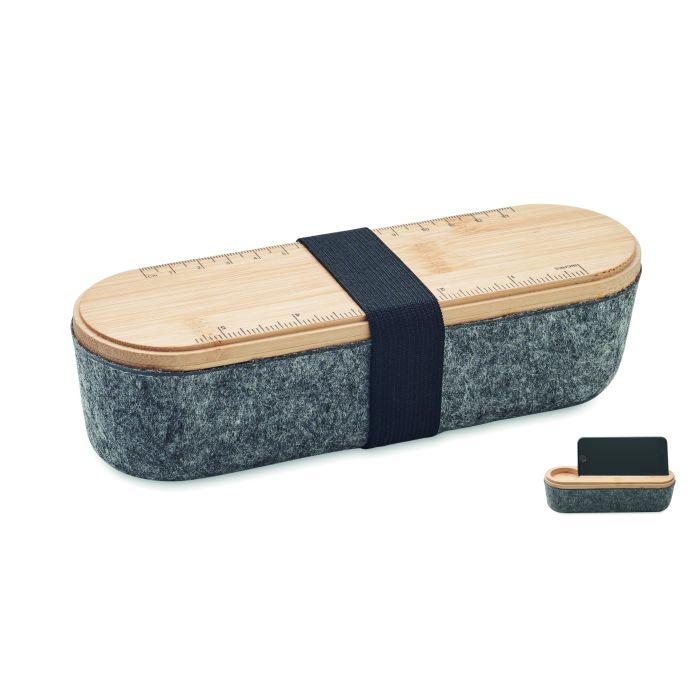 Husă pentru creioane din pâslă RPET cu capac din bambus și suport telefon integrat.