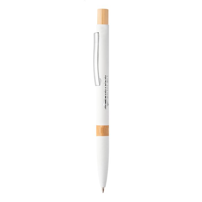 Pix din aluminiu reciclat cu părți din bambus, finisaj cauciucat și clemă cromată. Cu acoperire specială pentru gravarea laser în oglindă. Cu mină albastră.