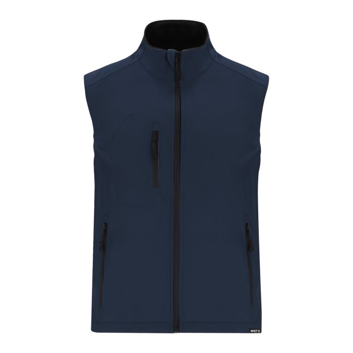 Vestă cu trei straturi, rezistentă la vânt și la apă, cu fermoar RPET, cu buzunare laterale și pe piept. Exterior: 94% poliester RPET și 6% elastan. Interior: 100% lână polară din poliester RPET. 340 g/m².