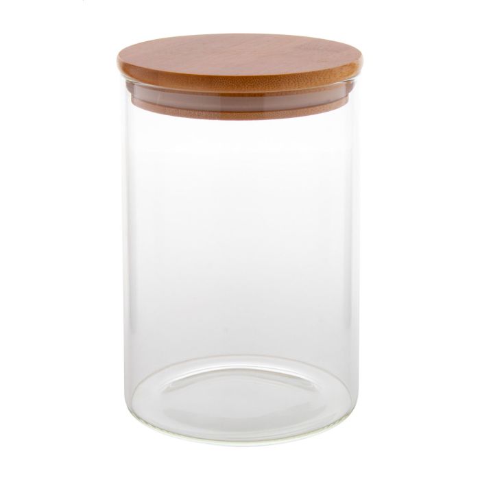 Borcan de depozitare, din sticlă borosilicată, cu capac din bambus, 1000 ml. Ideal pentru depozitarea alimentelor uscate și a ingredientelor.