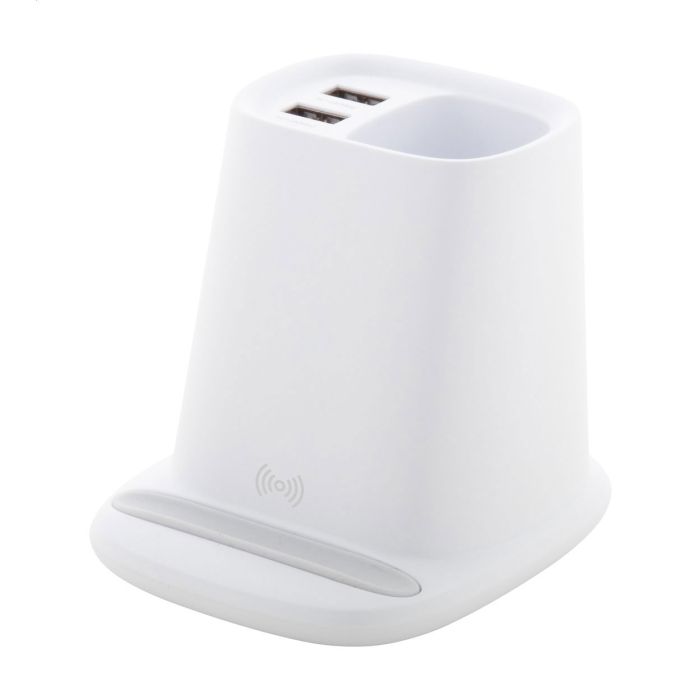 Suport multifuncțional pentru pixuri, din plastic, cu suport pentru telefon, încărcător rapid wireless incorporat (10W) si 2 porturi USB pentru încărcător (iese max 2000 mA). Inclusiv cablu de încărcare USB.