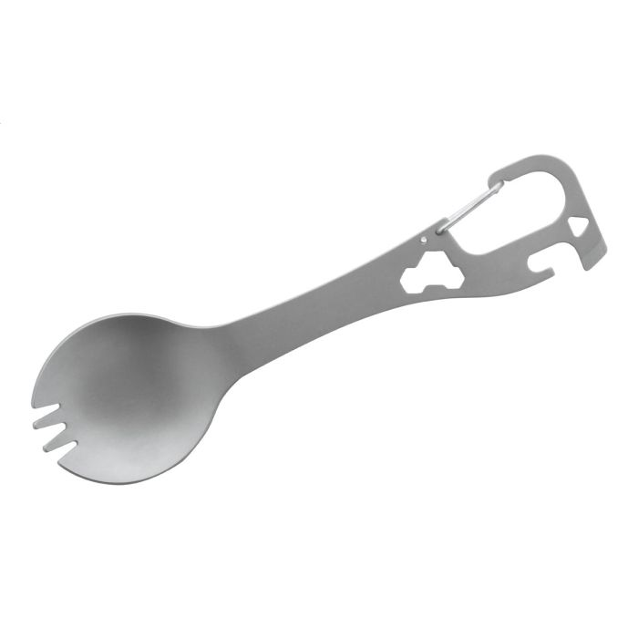 Unealtă multiplă cu tacâmuri din oțel inoxidabil (linguriță și furculiță) cu carabină.