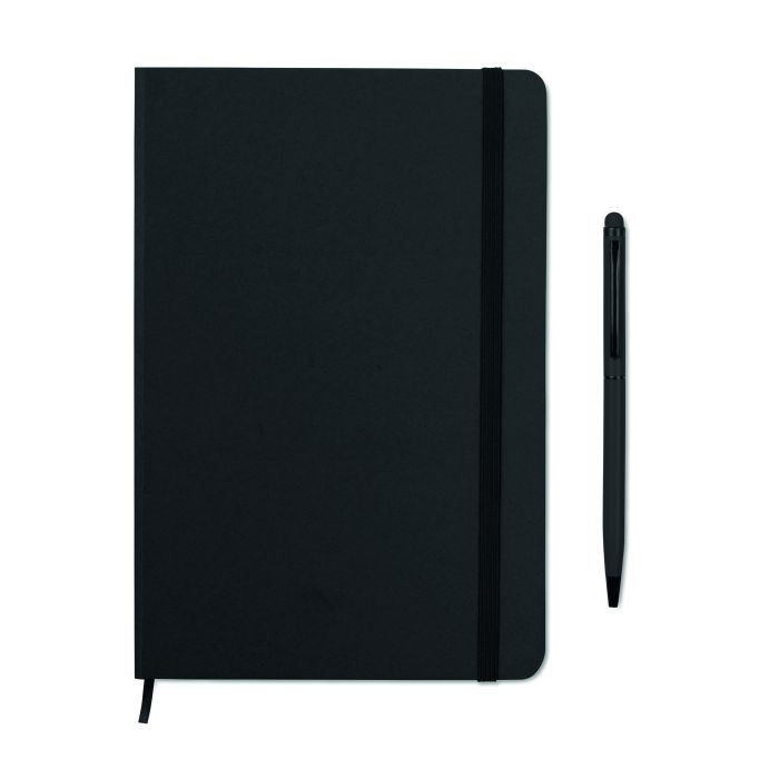 Agendă A5 cu pix tactil. Cu copertă tare. 144 pagini liniate (72 de file). Închidere elastică neagră și panglică asortată. Pix cu bilă touch-pencil de culoare asortată cu mină albastră. FSC MIX CREDIT | P7.1 | FSC-C213206