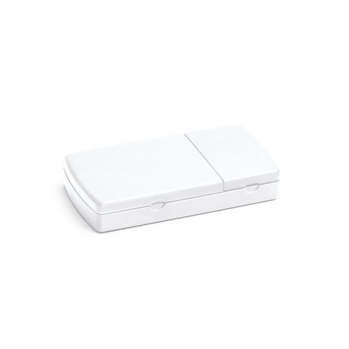 Cutie pentru pastile cu capac, 2 compartimente și tăietor. Compartimentele sunt detașabile și colorate, permițând distincția. 94 x 48 x 16 mm