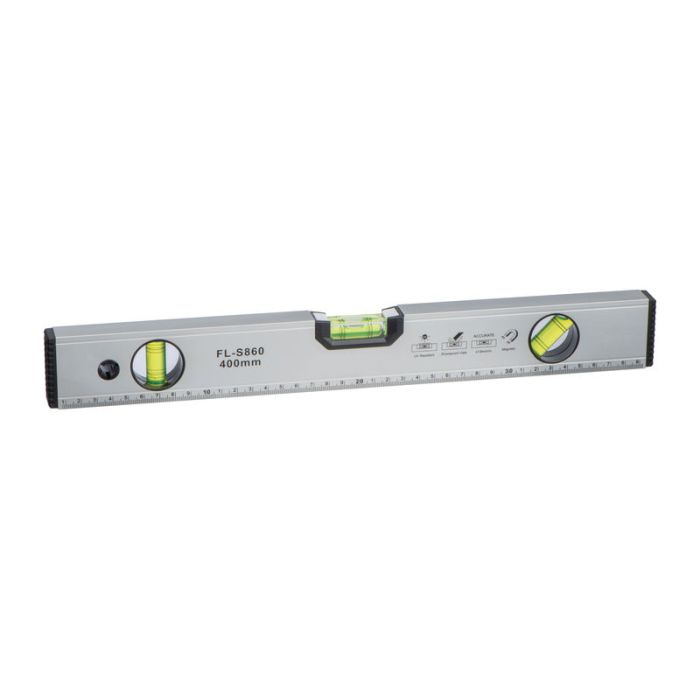 Nivela de aluminiu cu trei fiole (orizontală, verticală și 45°), bază magnetică și scală de 40 cm.