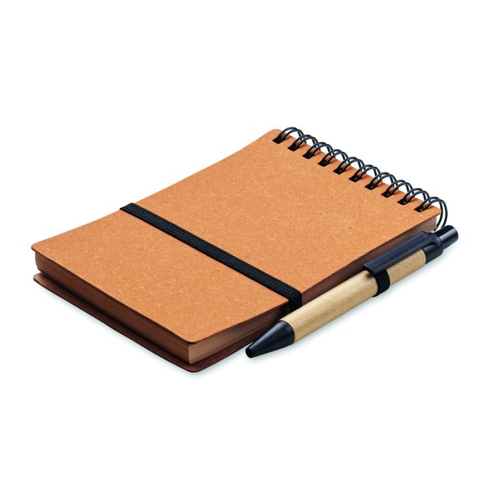 Notes cu copertă din hârtie reciclată și PU (70% hârtie reciclată și 30% PU). Twin-wire. 140 de pagini liniate din hârtie reciclată (70 de foi). Pix cu buton asortat din carton reciclat și părți ABS. Mină albastră. Curea de închidere elastică și suport pentru stilou. FSC®-certified | FSC MIX CREDIT, P7.1, FSC-C213206