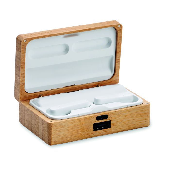 Căști TWS cu microfon în cutie de bambus. Include powebank urgență de 1200 mAh cu intrare tip C și ieșire tip A. Auto-împerechere.