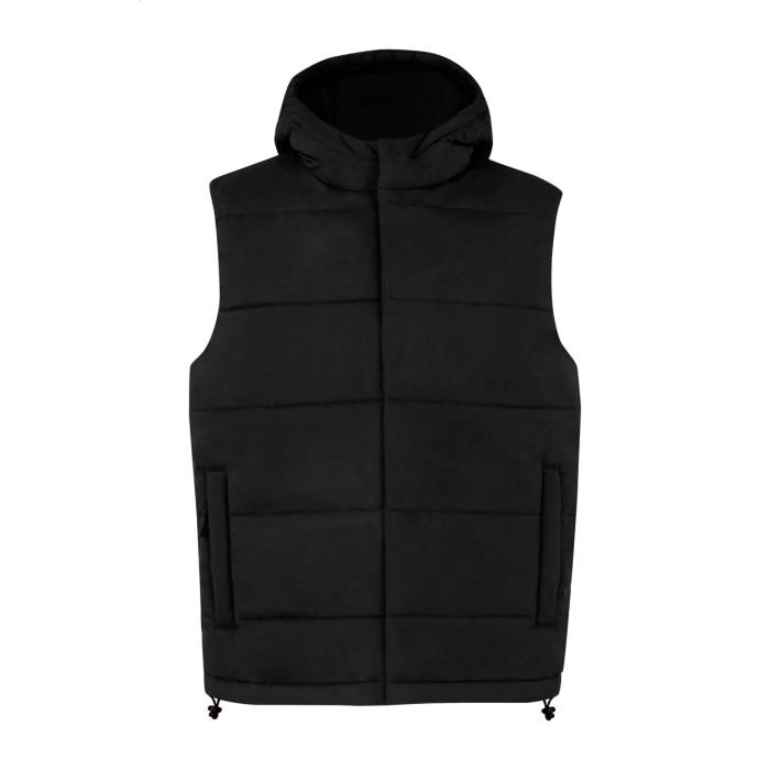 Vestă căptușită, rezistentă la vânt și apă, cu fermoar frontal dublu și inchidere cu nasture. Cu glugă și buzunare laterale. 100% Poliester.