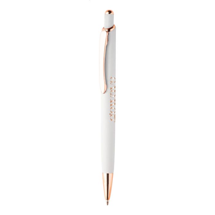 Pix din aluminiu reciclat, cu finisaj cauciucat și detalii auriu roz. Cu acoperire specială pentru gravarea laser în oglindă în culoarea aur roz. Cu mină albastră.