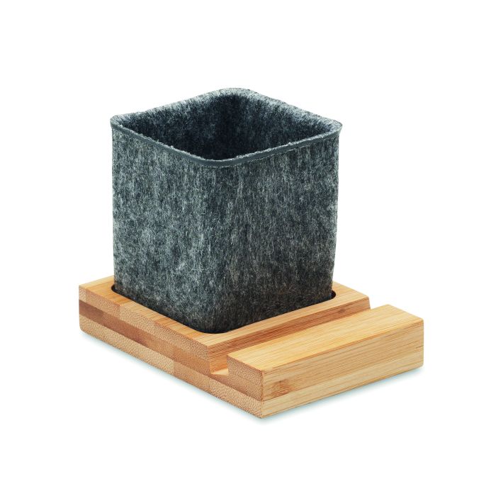Suport pentru pixuri din pâslă RPET cu bază din bambus și suport pentru telefon.