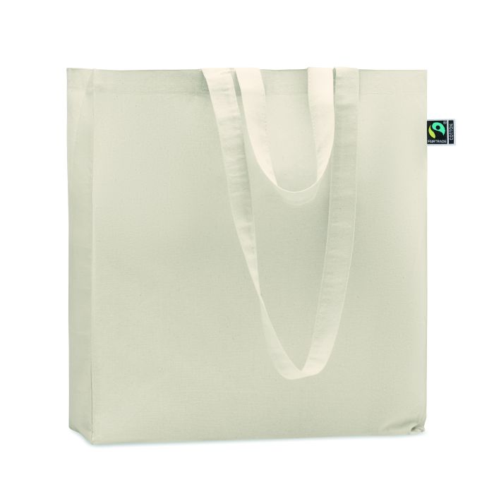 Geantă de cumpărături din bumbac Fairtrade cu mânere lungi și burdufuri. 180 gr/m². Acest produs este certificat OEKO-TEX® STANDARD 100.