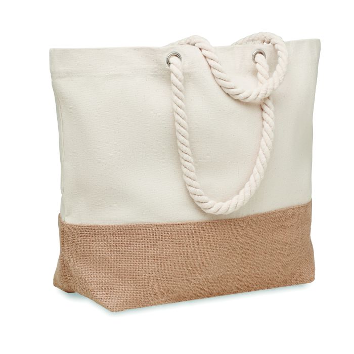Geantă de plajă sau geantă de cumpărături din canvas cu mâner rasucit și insertii din iută. 280 gr/m².