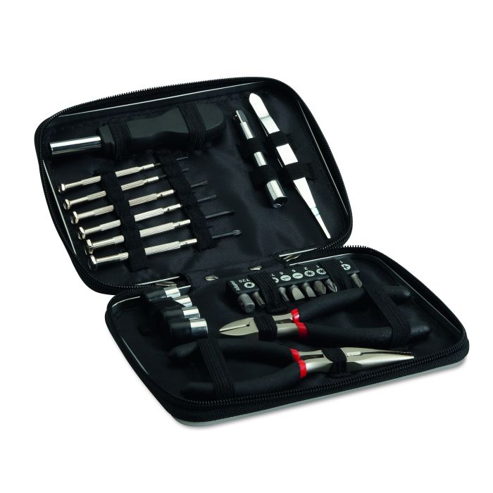 Set în cutie de aluminiu cu patent, un cleștișor, 1 șurubelniță, un prelungitor, 10 buc. capete de șurubelniță, o pensetă și 6 șurubelnițe de precizie.