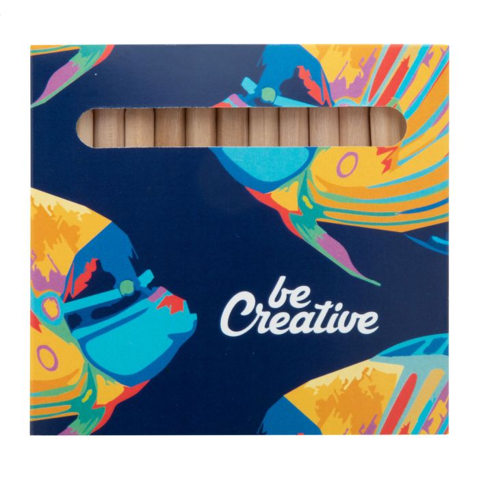 12 buc creioane colorate din lemn în cutie de hârtie imprimată full colour. Prețul include imprimarea digitală. Cantitate minimă de comandă: 100 buc.