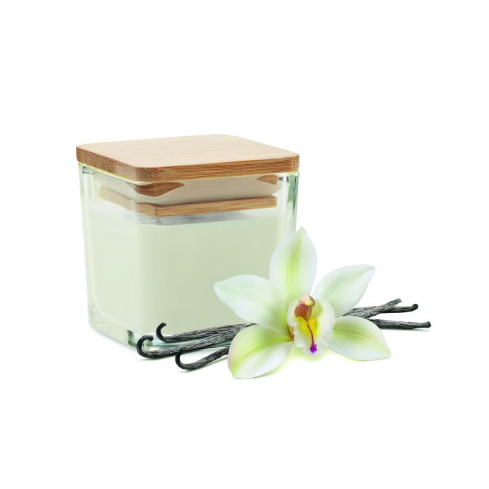 Lumânare de ceară parfumată pe bază de plante în suport de sticlă pătrată cu capac din bambus. 50 gr. Timp de ardere: 8 ore. Alb(06) vanilie, galben(08) lămâie, portocaliu(10) portocală, verde(48) măr.
