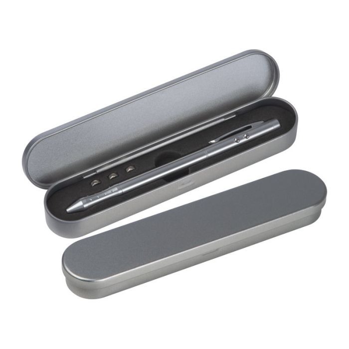 4-in-1 laser pointer din metal + LED, şi pix cu mină albastră și roșie in penar atractiv din metal.