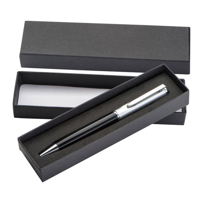 Pix elegant negru cu parte superioară argintie şi mină albastră în ambalaj elegant.