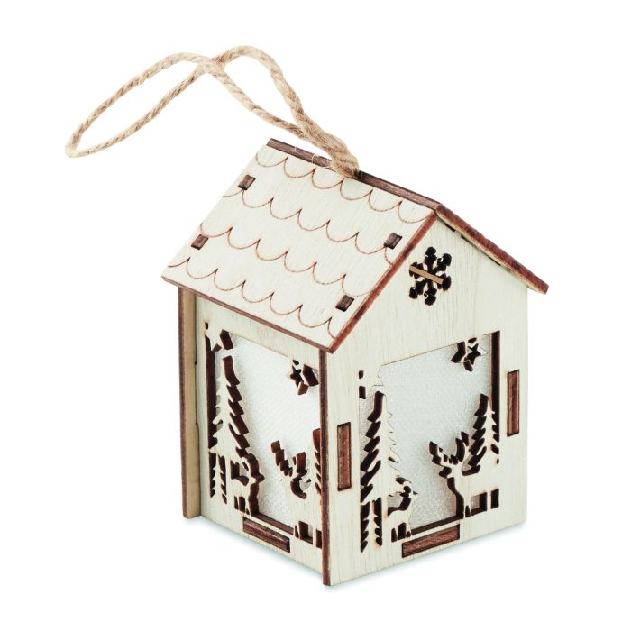 Căsuță MDF, decorată cu lumină interioară și ornamente de Crăciun, cu șnur pentru agățare. 3 baterii AG10 incluse.